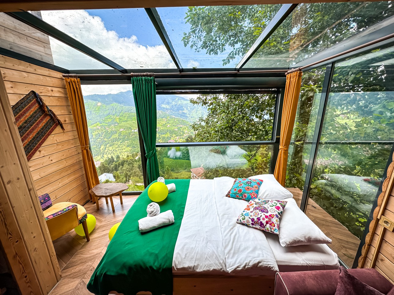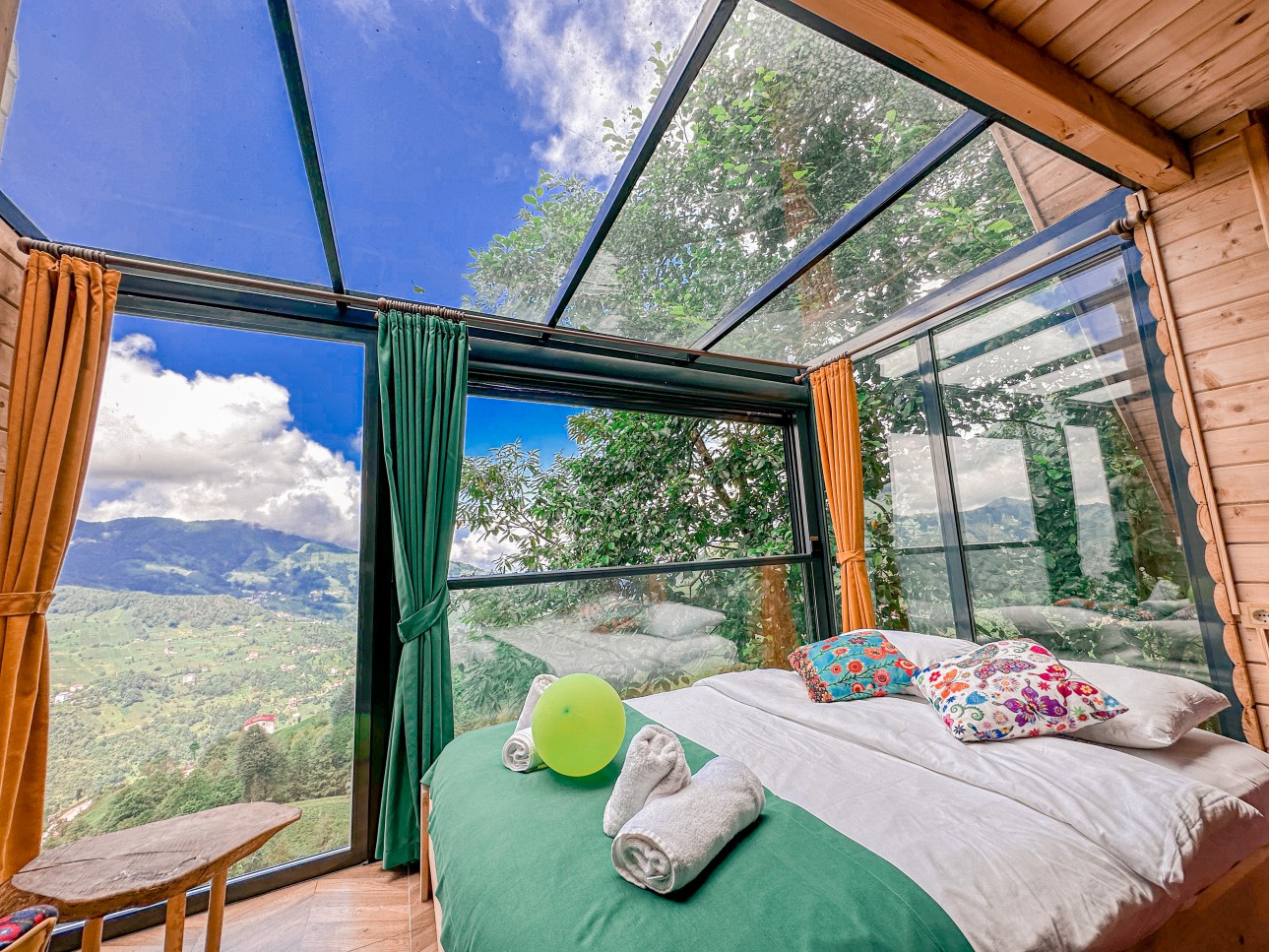 -Bungalov evimiz şömineli olup cam tavanlı terası ile muhteşem vadi ve dağ manzarasına sahiptir.