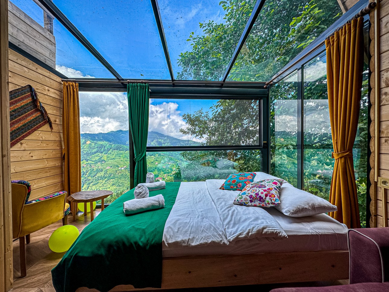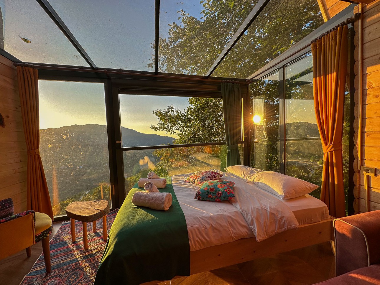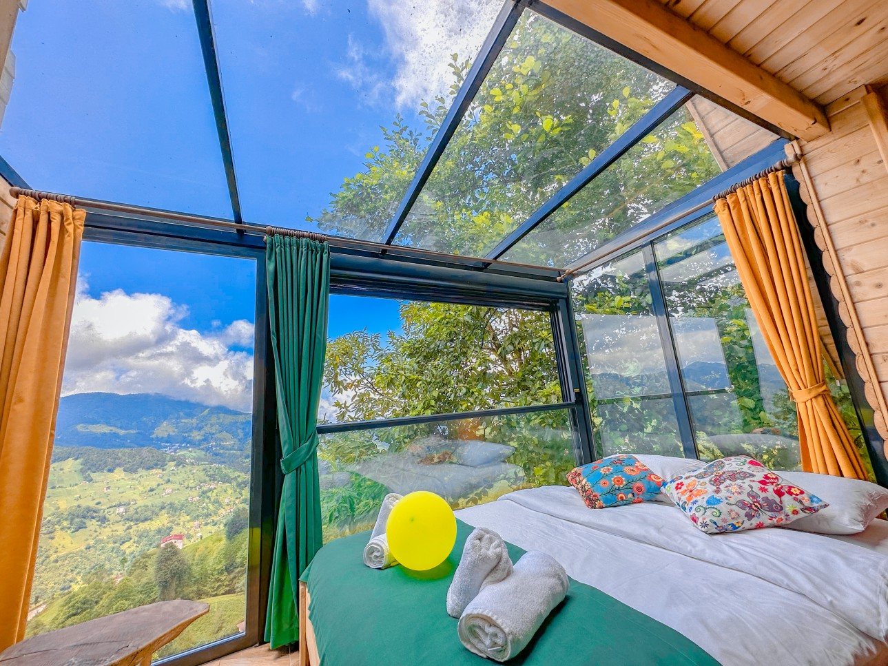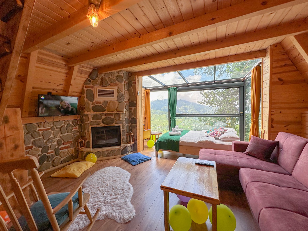 -Bungalov evimiz şömineli olup cam tavanlı terası ile muhteşem vadi ve dağ manzarasına sahiptir.
